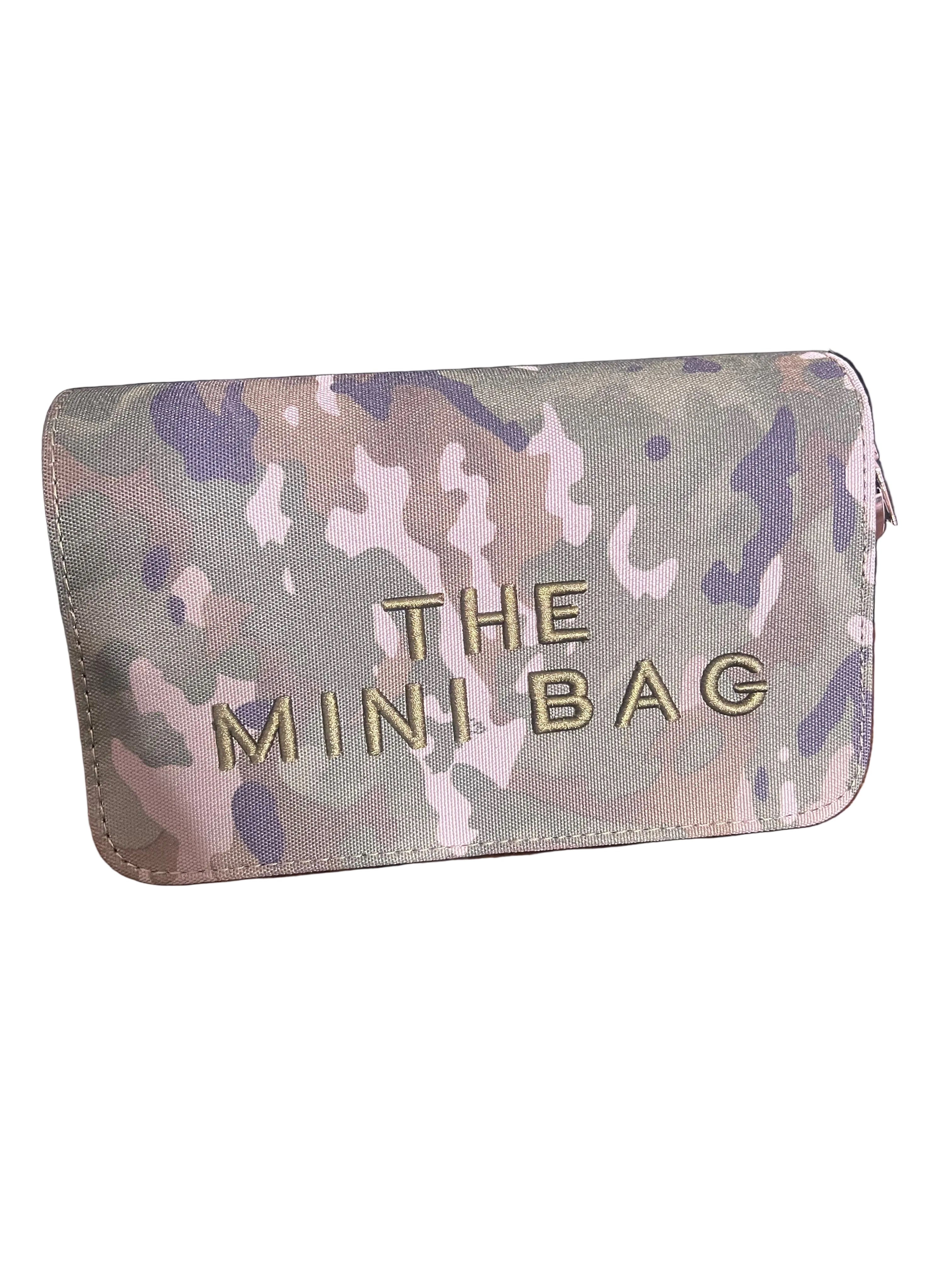 Camouflage mini crossbody bag featuring gold lettering that reads “The Mini Bag.” Compact yet stylish—perfect for carrying your essentials while adding a trendy, casual-cool touch to any outfit.
