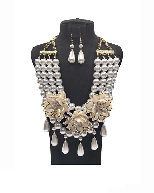 Stunning Pearl Necklace with Acrylic Flowers/ matching dangles